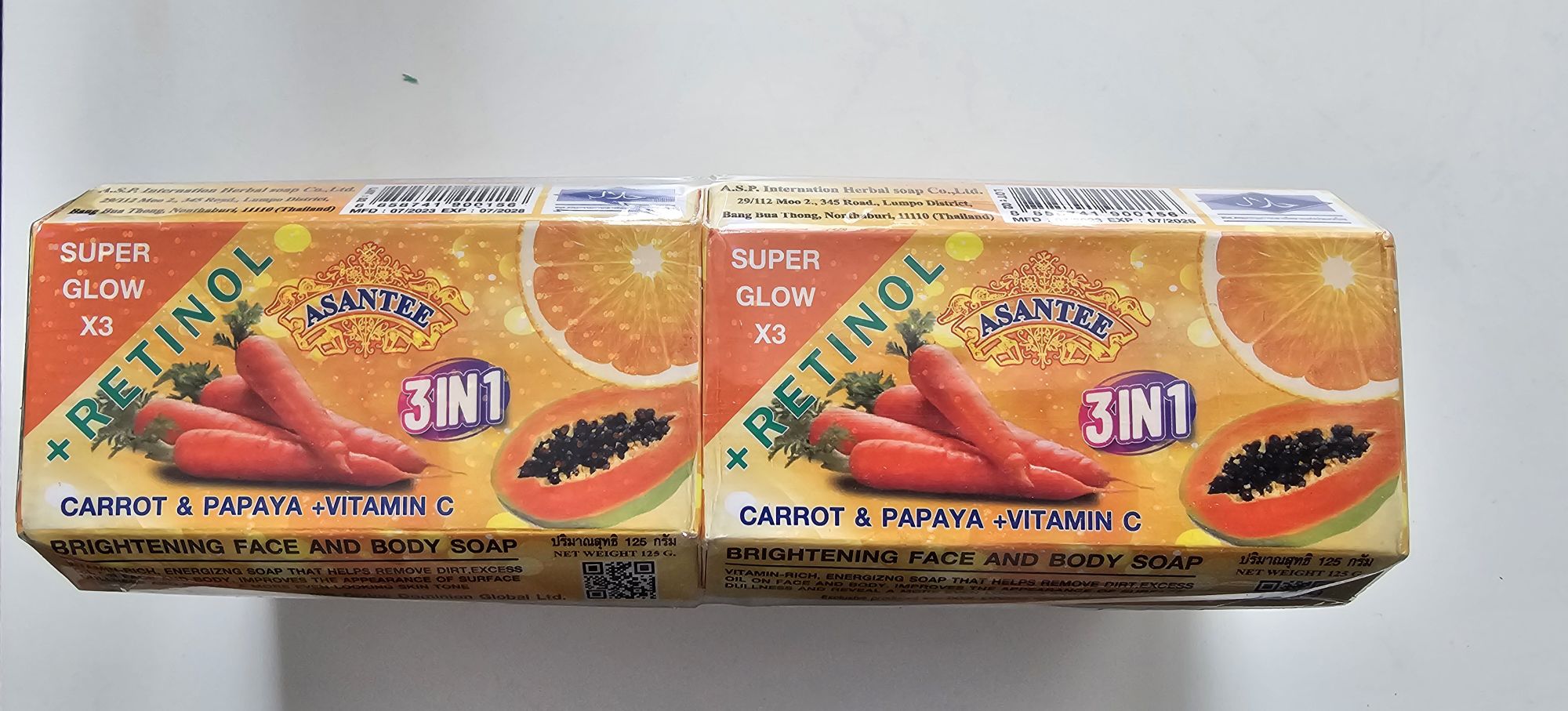 Retinol Asantee 3in1 Carrot & Papaya + Vitamin C Soap is a multi-action beauty soap designed to cleanse and care for the skin. The carrot, papaya, and vitamin C work together to help the skin feel fresh and look more radiant. The soap helps wash away dirt while leaving the skin soft and smooth. It is suitable for regular use on the face and body. A great choice for people who want a simple soap with extra skin-loving benefits.