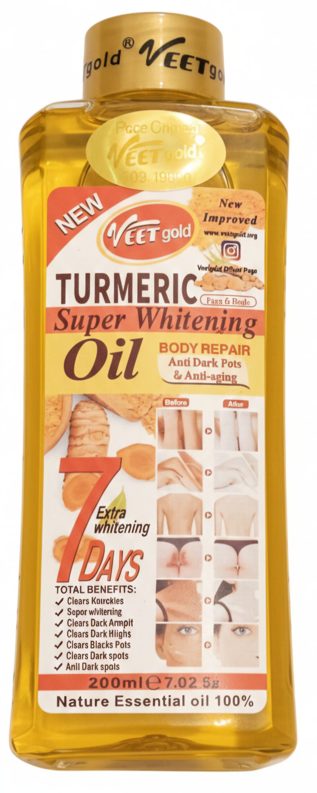 Give your skin a lovely glow with Veetgold Turmeric Oil. Made with natural turmeric, it helps your skin look bright, smooth, and lively. It’s perfect for dry or tired skin and feels light and gentle. Use a few drops each day to keep your skin soft and healthy-looking.