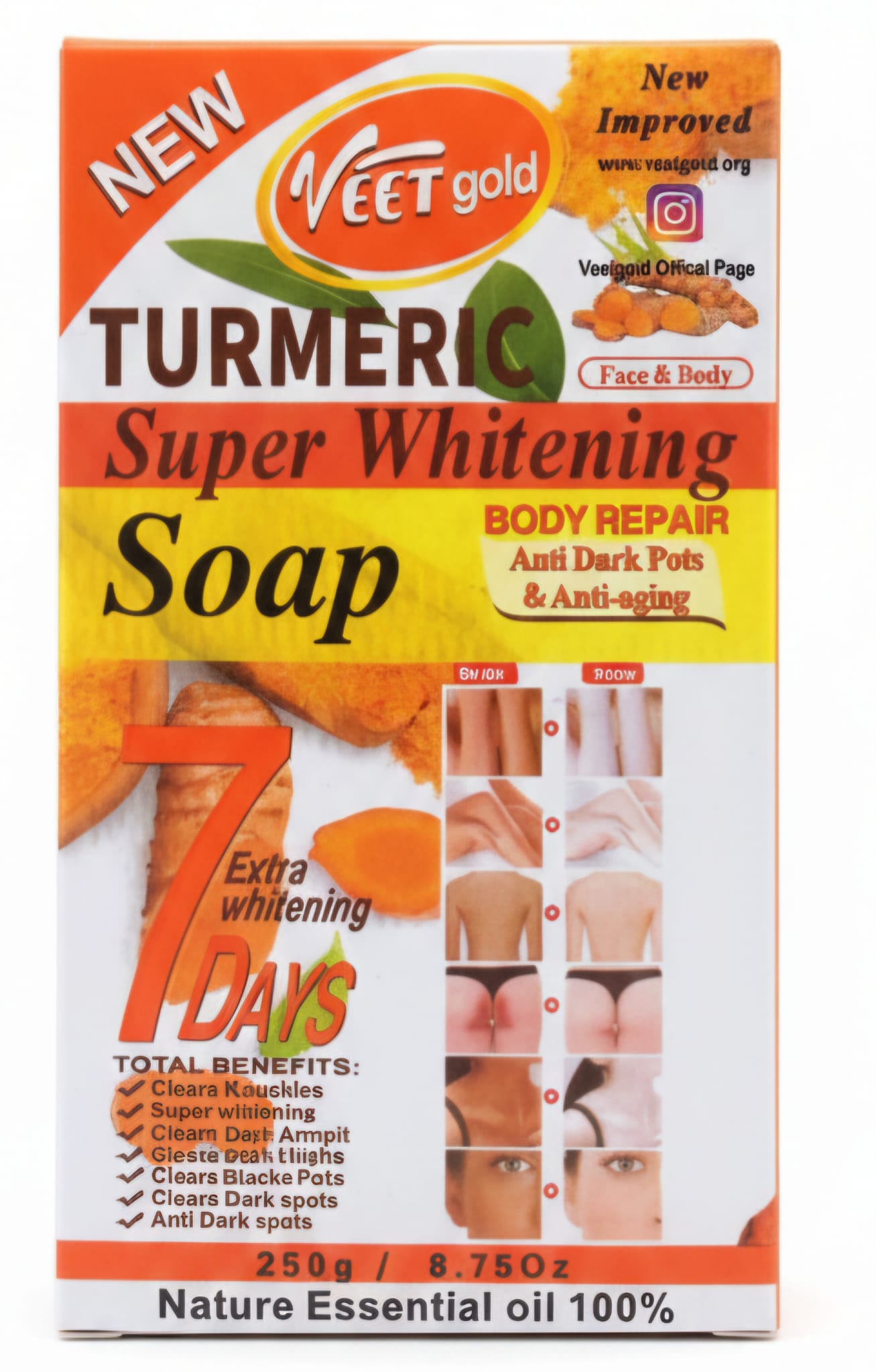 This soap is full of goodness! Veetgold Turmeric Super Whitening Soap helps wash away dirt while leaving your skin fresh and bright. The turmeric inside helps even your skin tone and makes it feel silky after every wash. Great for daily use on the face and body.